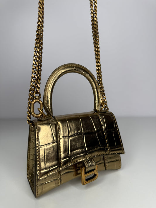 Balenciaga Gold Croc Embossed Hourglass Nano Top Handle Bag