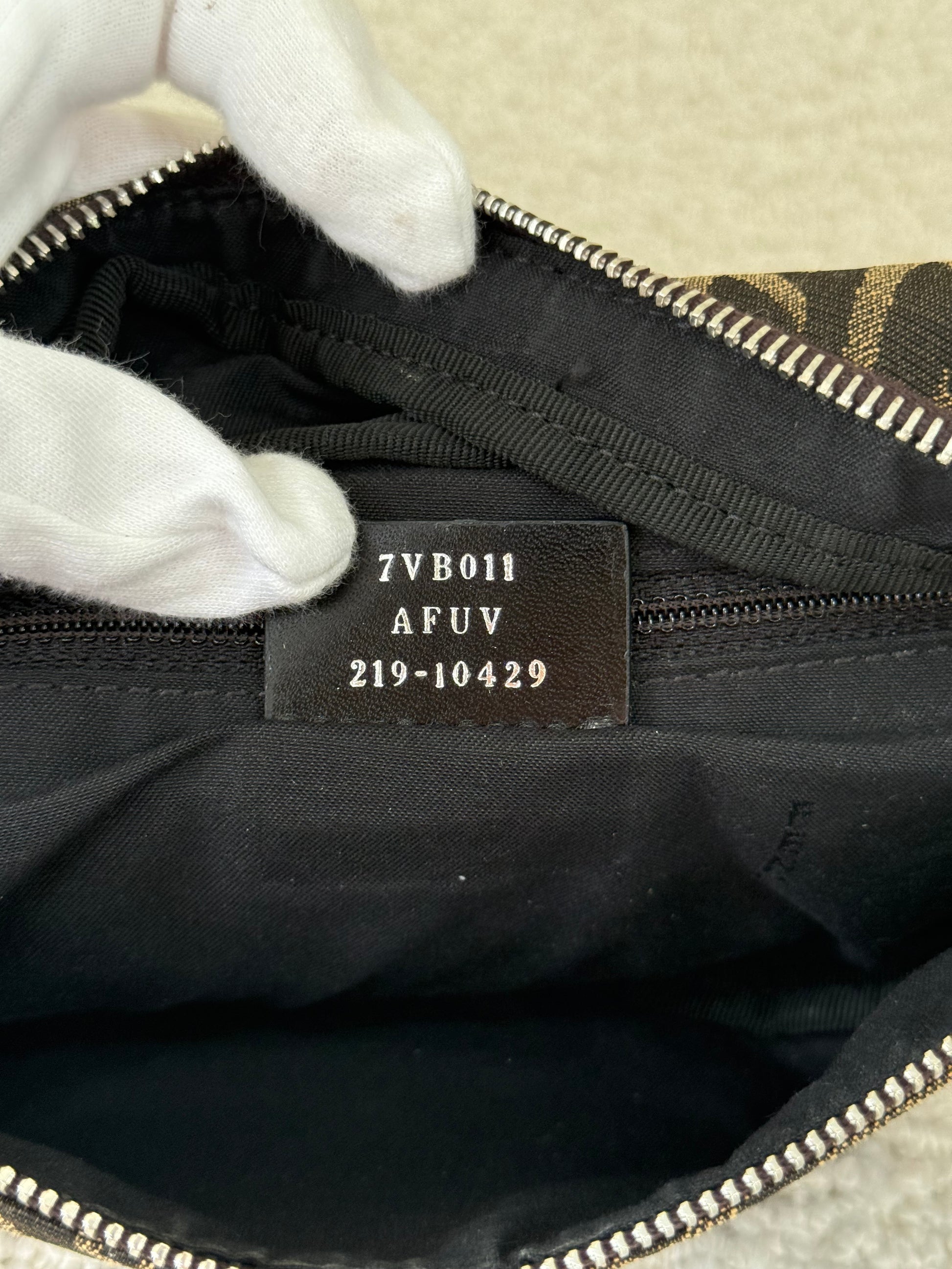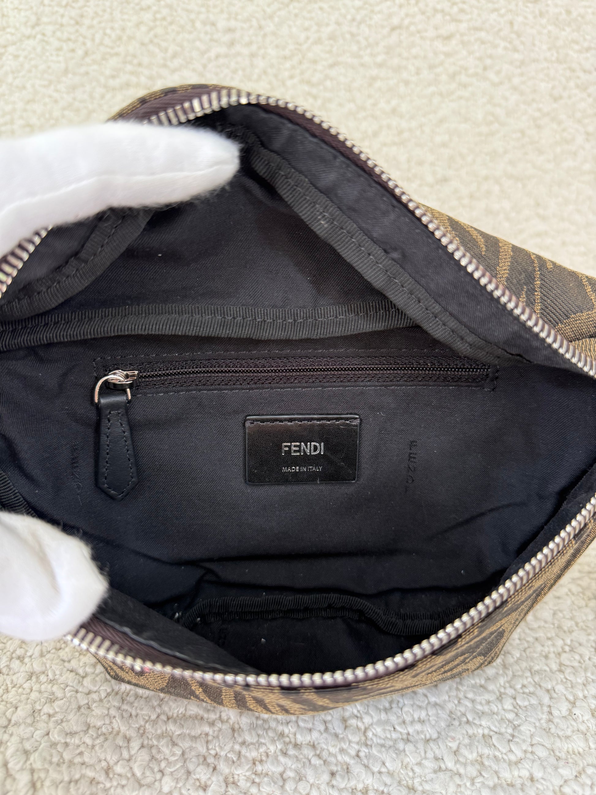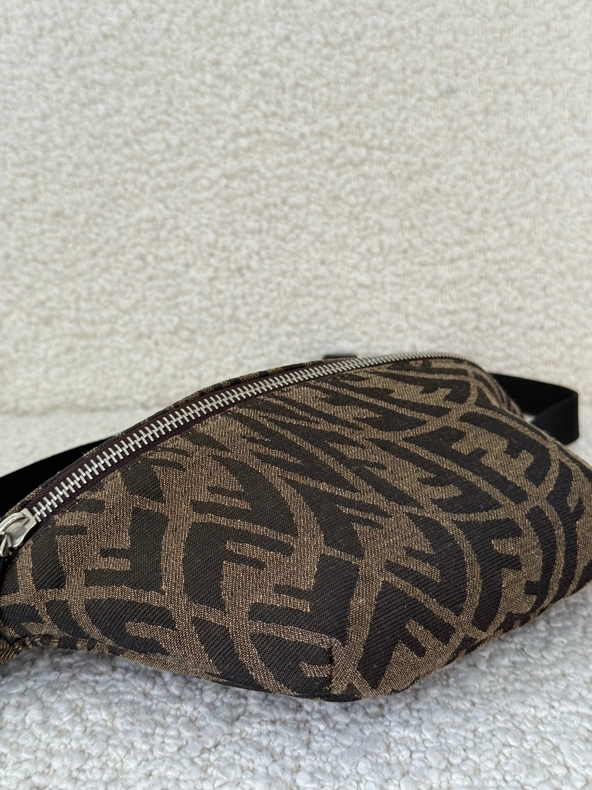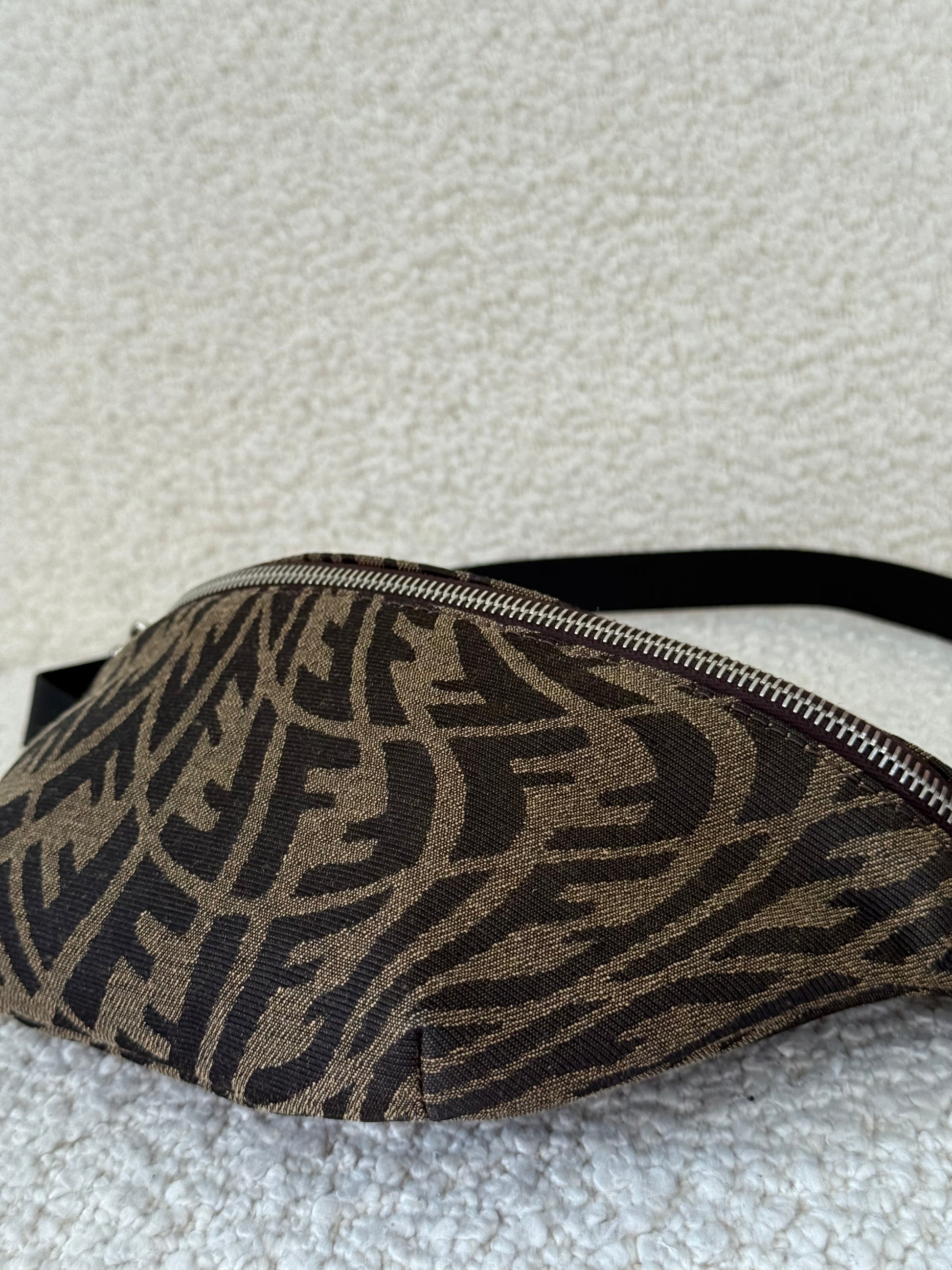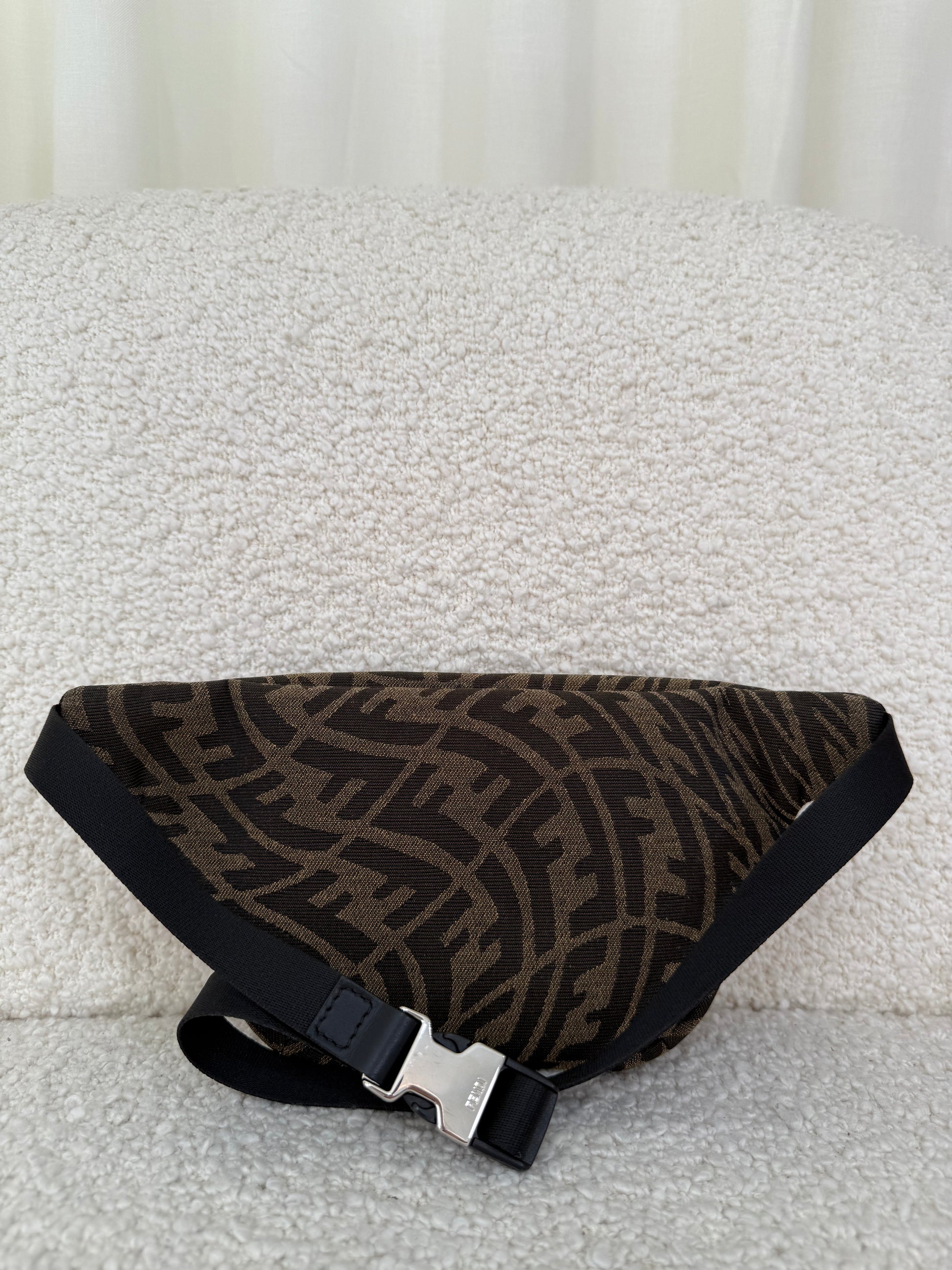 The Fendi FF Vertigo Belt Bag in Brown features the iconic FF Vertigo monogram in a distorted design for a modern twist on a classic look. Crafted from premium canvas with leather trim, it offers a sleek silhouette, adjustable belt strap, and zip closure—perfect for hands-free style with luxury flair.
