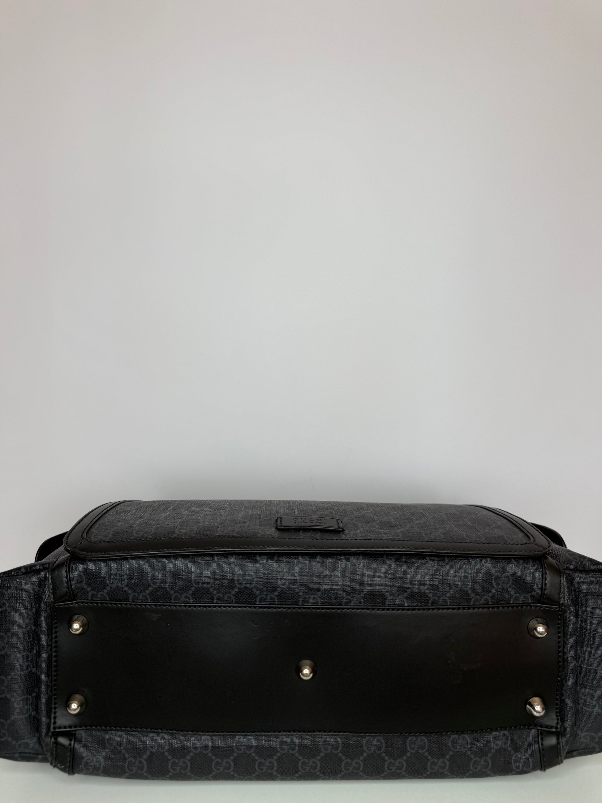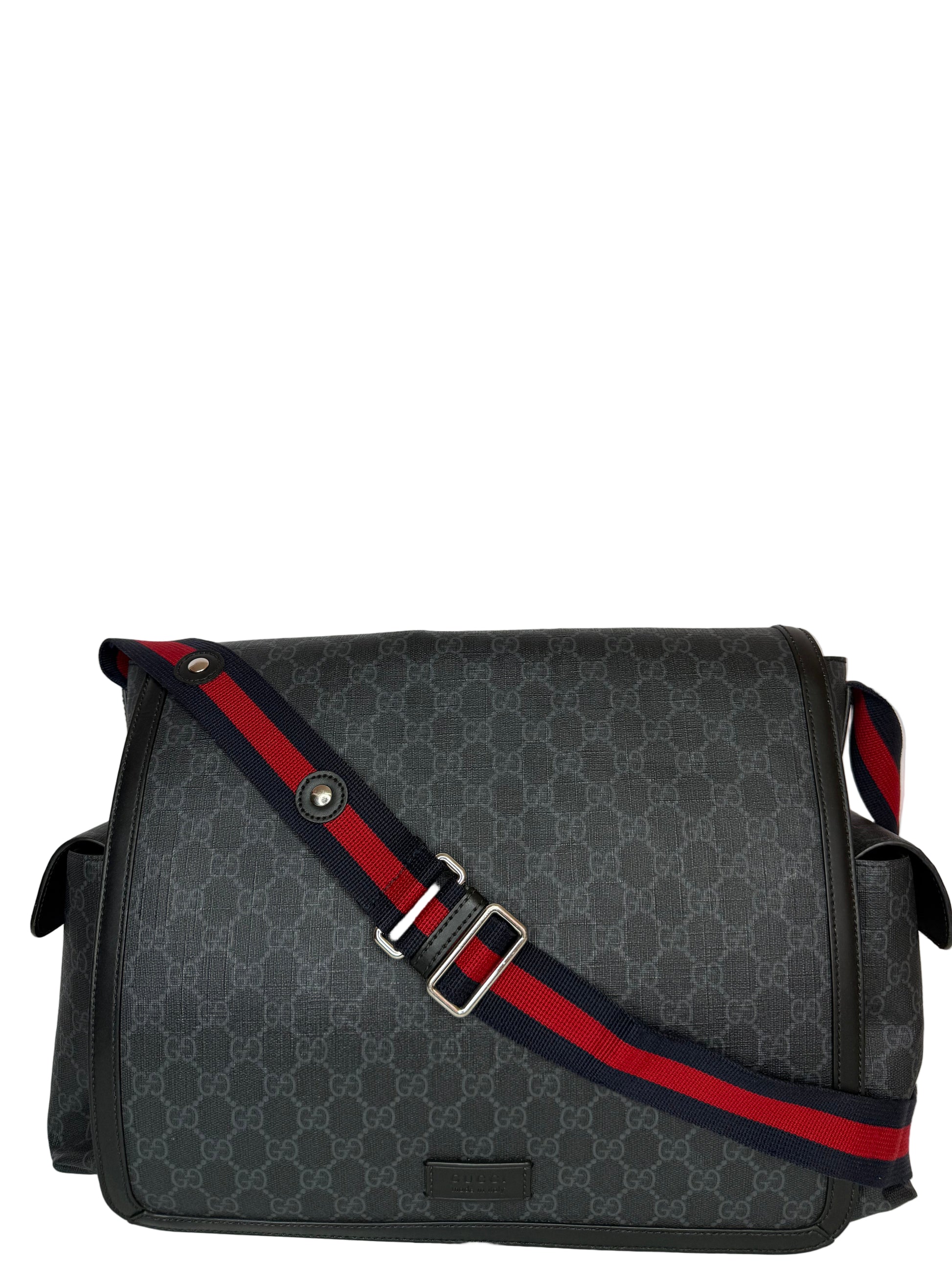 Gucci Messenger Diaper Bag in black and grey GG Supreme canvas, featuring the signature Web stripe, adjustable shoulder strap, and multiple compartments. A stylish and practical luxury bag designed for modern parents.
