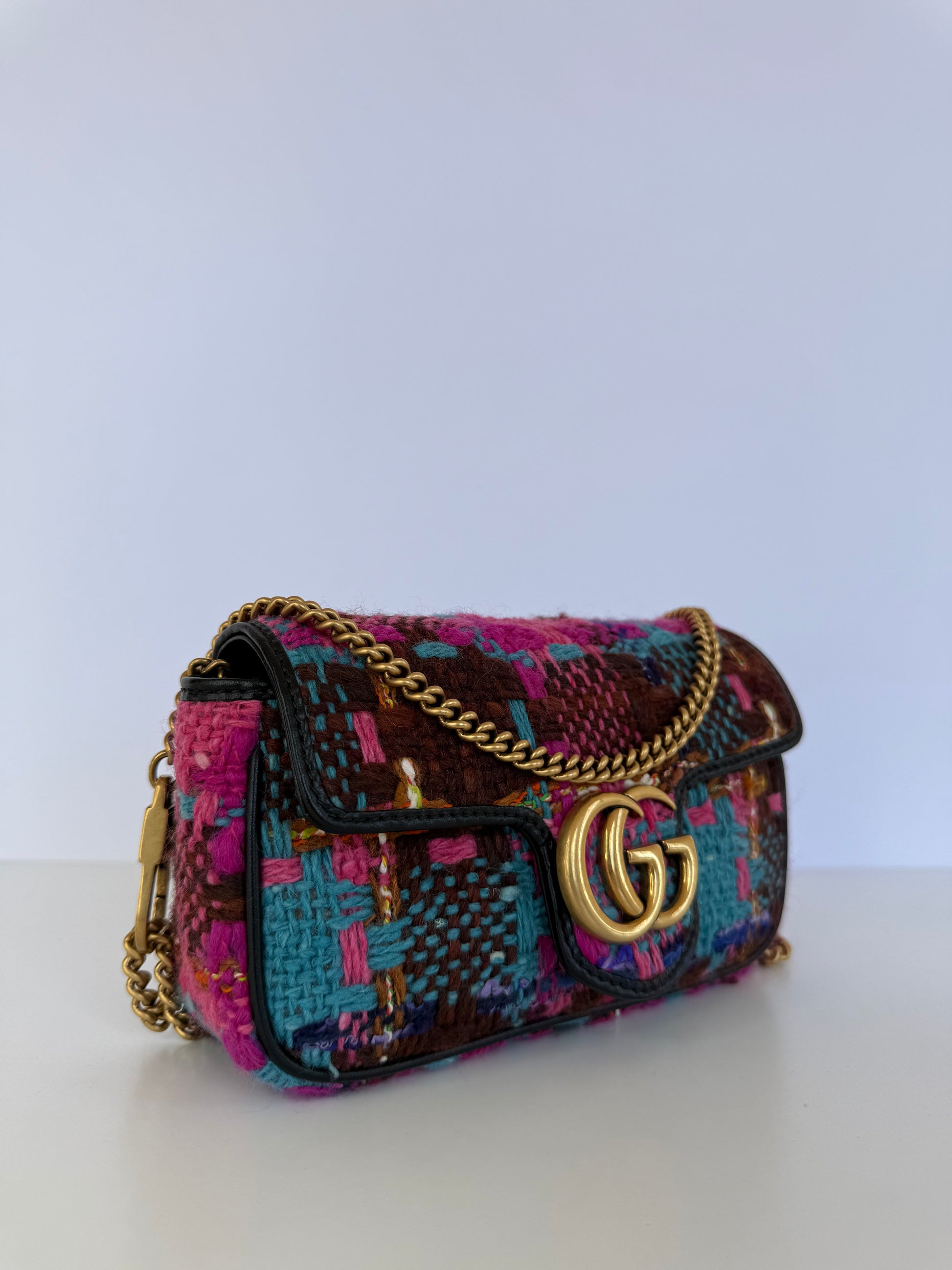 Gucci GG Marmont Super Mini Shoulder Bag in spicy check multicolor tweed and calfskin, featuring the signature quilted chevron design, gold-tone GG logo hardware, and a compact, stylish silhouette.