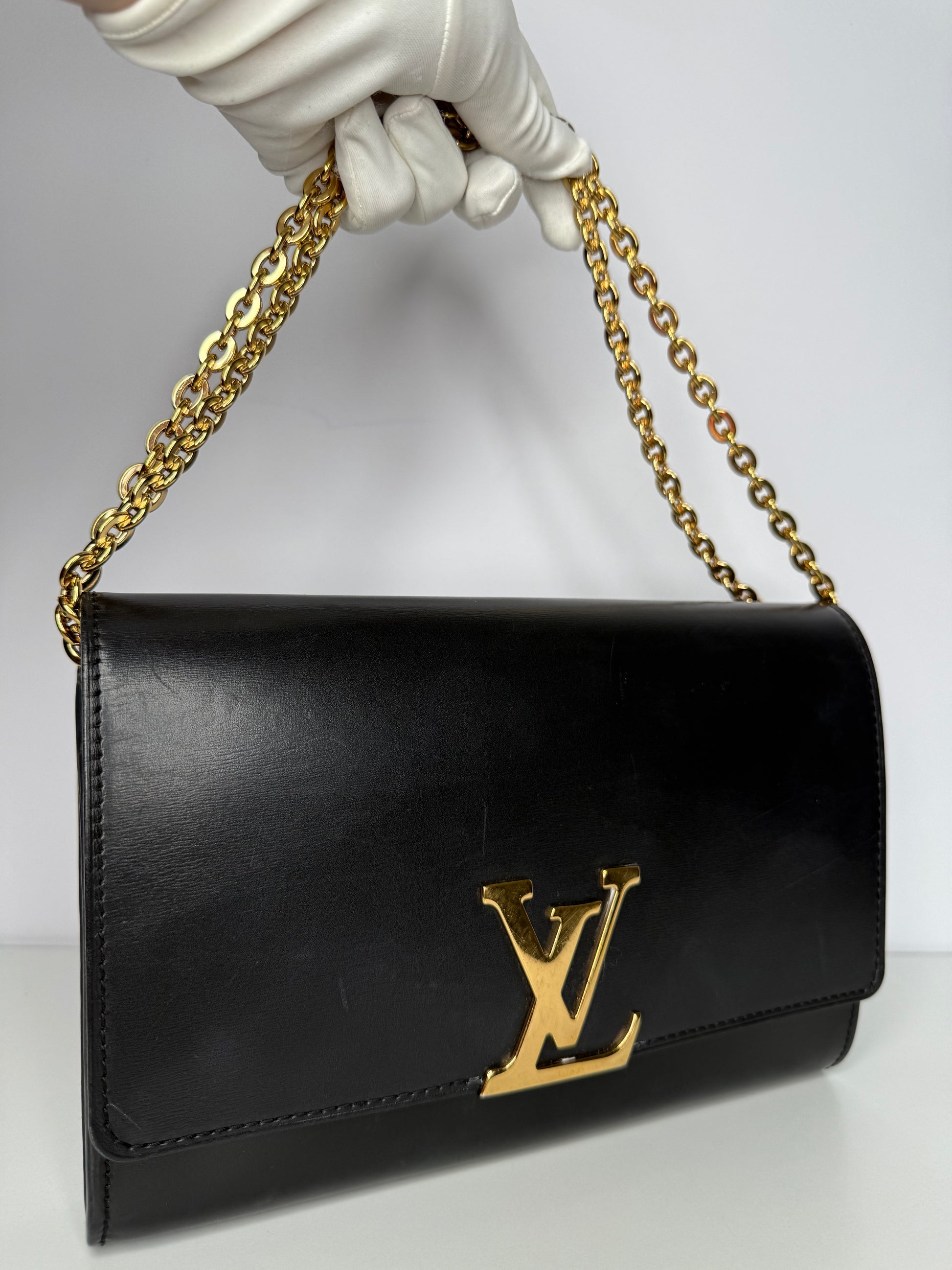 Louis Vuitton Black Calfskin Leather Chain Louise Clutch Bag, a sophisticated evening piece with timeless elegance. Features a sleek silhouette, gold-tone chain strap, and signature LV clasp for refined style.